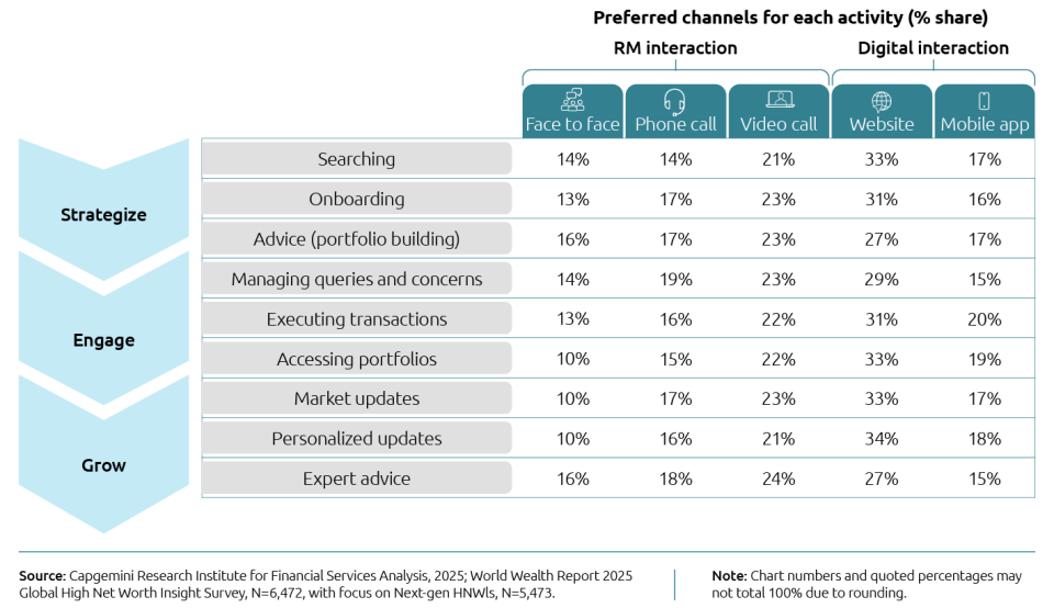 For example, despite the pervasiveness of mobile apps, a surprising finding from the report was Next-gen HNWIs’ stronger interest in video call and website interactions versus mobile apps (Figure 1). Across some types of interactions, like making inquiries or addressing a concern, even the old-school phone call prevailed over apps.