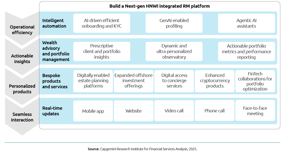 Keep RMs focused on client engagement by supporting them with a sophisticated, AI-powered integrated digital platform that combines back-office task automation with advanced analytics, research abilities, and communications capabilities that rapidly transform massive amounts of data into actionable insights. By leveraging different intelligence technologies that integrate data from a wide variety of internal and external sources, these platforms empower RMs to efficiently deliver customized “segment-of-one” advice via the right channel at the right time.u003cbru003eu003cbru003eHallmarks of a robust and intelligent integrated digital platform include:u003cbru003eu003cbru003eu003cstrongu003eOperational task automation.u003c/strongu003e Automating repetitive and time-consuming tasks, like onboarding and compliance activities, reduces or eliminates RM intervention, which significantly improves advisor productivity and Next-gen HNWI experiences. Using Agentic AI and other technologies lets firms automate standardized processes, like completing complex portfolio analysis and generating related documents or reports.u003cbru003eu003cbru003eu003cstrongu003eActionable 360-degree insights.u003c/strongu003e An advanced platform can help RMs generate multiple, holistic insights. Examples include self-service RM features for building customized client views or analyzing client preferences and behavioral dynamics to create various scenarios, product mixes, and offers for an RM to present.u003cbru003eu003cbru003eu003cstrongu003ePersonalized product recommendations.u003c/strongu003e With AI analyzing complex client preferences and goals, tracking a client’s evolving situation, examining previous client interactions, and scrutinizing external information – like social media posts – a robust platform can generate hyper-personalized product recommendations and client-centered advice about complicated portfolio aspects, such as account structures, tax planning, or ESG screening.u003cbru003eu003cbru003eu003cstrongu003eSeamless omnichannel interactions.u003c/strongu003e Beyond giving advisors chatbots to speed up decision-making, an integrated platform also lets RMs seamlessly and automatically connect clients with resources. For example, an AI agent can orchestrate client portfolio monitoring, RM calendars, and contextual information to automatically prepare the appropriate client reports, like quarterly reviews. It can also generate the accompanying meeting invitations, reply to client meeting preferences, and populate an RM’s calendar with agreed upon dates and times. Or, for a client who needs assistance from a WM firm’s external partner, the platform can rapidly assemble acceptable options and connect the parties using preferred engagement channels.u003cbru003eu003cbru003eu003cstrongu003eFlexible and scalable.u003c/strongu003e Equally important as a platform’s intelligence is its ability to meet future business needs, help WM firms capitalize on new market opportunities, and evolve as new technologies emerge. In other words, flexibility and scalability are critical for continuously advancing the RM platform to include additional forms of AI, process ever-larger data sets, handle an enlarging partner ecosystem, and manage an expanding array of product offerings.